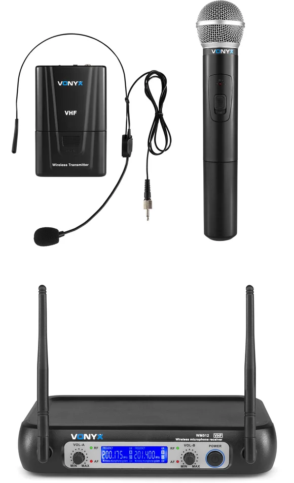 Vonyx WM512C 2-Kanal-VHF-Drahtlos-Mikrofonsystem-Kombi mit Handgerät, Taschensender und Display