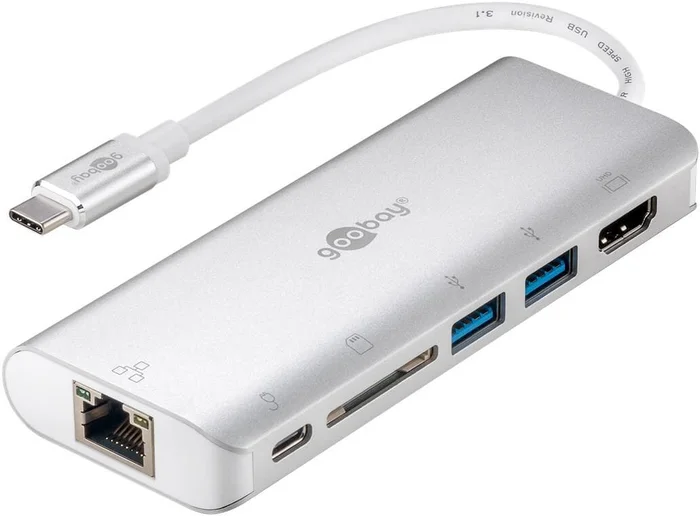 Goobay USB-C™-Multiport-Adapter HDMI 4k30Hz, USB, CR, RJ45, PD, Alu, silber – erweitert ein USB-C™ G