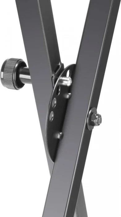 Dieser standfeste, besonders kompakte X-Keyboardständer aus stabilem, schwarz pulverbeschichtetem Stahl ist in 5 Stufen von 64 cm bis 98 cm bequem höhenverstellbar. Die breiten Auflagen sorgen mit geriffelten Gummiringen für einen rutschfesten Halt des Instruments.