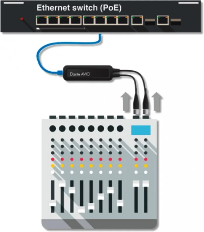 - Für den Anschluss von analogen Audio-Line-Level-Geräten (z. B. Mischpult) an ein Dante®-Audio-Netzwerk