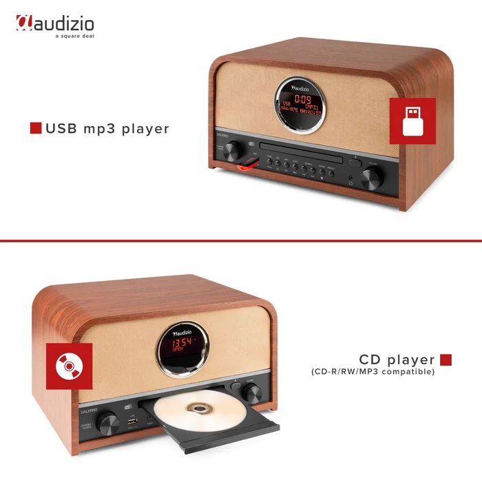 Neben normalen (Original-)CDs kann der eingebaute CD-Player des Salerno auch CD-R, CD-RW und MP3-CDs abspielen. So können Sie Ihre CD-Sammlung weiterspielen und in Stereo mit hoher Klangqualität genießen.