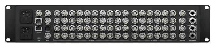 - Audioeingänge insgesamt: 2 symmetrische 1/4-Zoll-Buchsen, 1x 32 Stereokanäle über BNC- und MADI-Eingänge, 1x 5-polige XLR-Buchse für Talkback