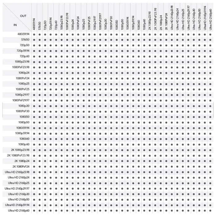 - Auf- und Abwärts- sowie Cross-Konvertierungen und SD-/HD-/UHD-Normumwandlungen in Echtzeit