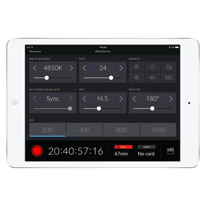 - Externe Steuerung: Blackmagic SDI Control Protocol, iPad-Steuerung, Bluetooth-Steuerung, 2 x 2,5mm-LANC-Anschlüsse für Objektiv- und Aufnahmesteuerung
