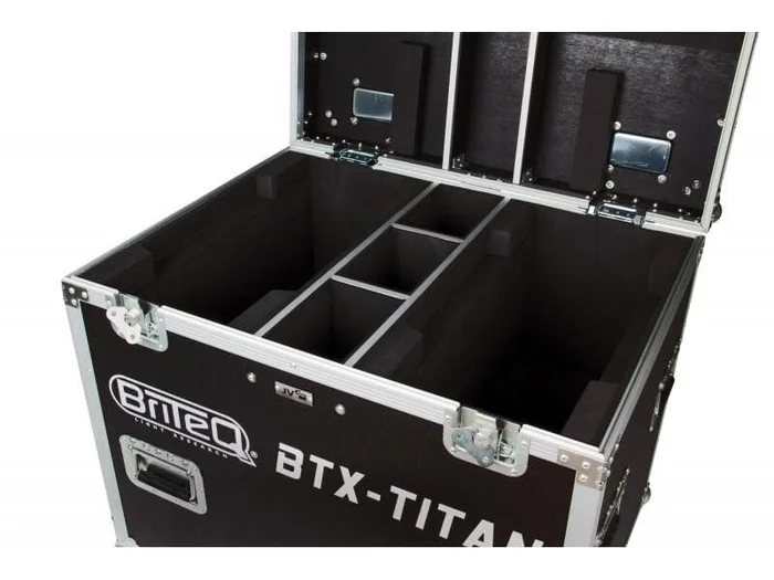 Robustes Flightcase mit Rollen, für zwei Briteq BTX-TITAN Moving Heads. Die stabile Konstruktion mit Aluminiumschienen und Kugelecken schützt Ihre Geräte vor Beschädigungen.