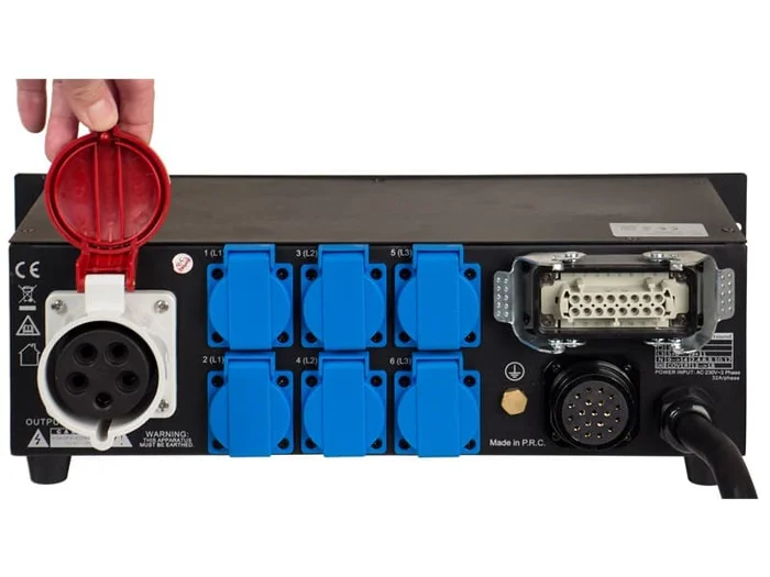 - Stromeingang IEC60309-standard, CEE-32A Industirestecker 380V–400V / 50Hz, 3 Phasen, 5 adrig (3P+N+E)