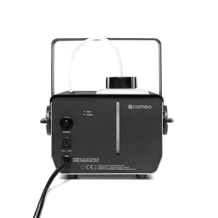 Über eine Funkfernbedienung oder Kabelfernbedienung lässt sich der Nebelausstoß auch aus der Entfernung ein- und ausschalten. An den Geldbeutel wie auch an die Umwelt ist gedacht, denn der Einsatz erfolgt wirtschaftlich und umweltfreundlich unter Verwendung herkömmlichen Nebel-Fluids auf Wasserbasis (z.B. Cameo DJ Fluid). Der herausnehmbare Fluid-Behälter erleichtert das Nachfüllen. Ein toller Effekt für den Bediener selbst ist die Beleuchtung des Fluid-Behälters von innen, um auch im Dunkeln stets den Füllstand des Fluids im Auge behalten zu können. Der integrierte Überhitzungsschutz verlängert die Lebensdauer des Geräts und steigert die Betriebssicherheit gleichermaßen. Mit der integrierten Kabelöse zum Anschlagen eines Sicherheitsfangkabels ist die Montage in der Höhe und über Kopf unter Einhaltung der gebotenen Sicherheitsvorkehrungen problemlos möglich.