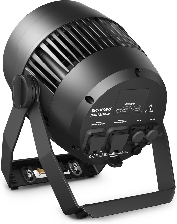 Der ZENIT® Z 180 G2 kann über 7 DMX-Modi gesteuert oder als Master, Slave und Standalone eingesetzt werden. Das helle OLED-Display mit 4 beleuchteten berührungsempfindlichen Bedienfeldern macht die Menü-Navigation und Konfiguration spielend leicht, unbefugte Einstellungsänderungen werden durch eine Zugriffsperre verhindert. Für eine nahezu geräuschlose Funktion ist das extrem robuste Gehäuse aus Aluminium-Druckguss mit einem temperaturgesteuerten Lüfter ausgestattet. 5-polige DMX-Buchsen und der powerCON TRUE1- kompatible Netzein- und Ausgang erlauben eine problemlose Parallelschaltung. Der Cameo ZENIT® Z 180 G2 arbeitet an allen Spannungen von 100 – 240 Volt.