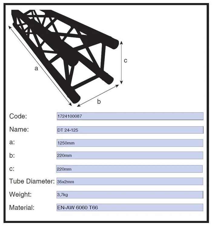 Das DT24/2 System ist ein 4-Punkt-Traversensystem, das mit vier konischen Verbindern, Bolzen und Sicherungsstiften verbunden wird.