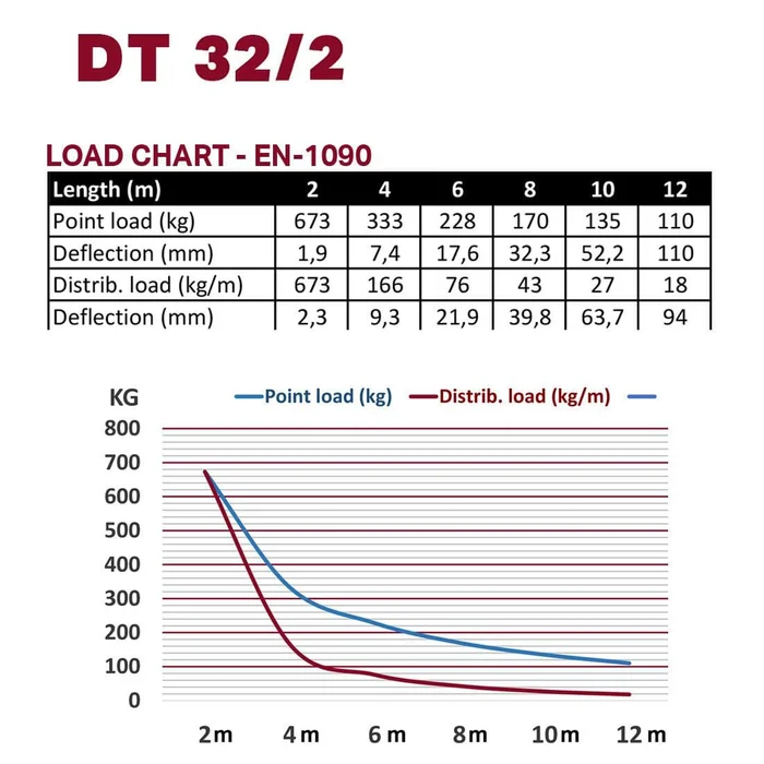 Das DT32 ist ein 2-Punkt-Traversensystem, das mit zwei konischen Verbindern, Bolzen und Splint verbunden wird. Der Vorteil beim Schnellverbinder-System liegt darin, dass es kraftschlüssig mit dem Gurtrohr (auch Tragrohr oder Hauptrohr genannt) abschließt und eine schnelle Montage beim häufigen Auf- und Abbau ermöglicht. Die zwei Gurtrohre sind aus 50 mm Aluminiumrohr mit 2 mm Wandstärke gefertigt und geben diesem System ein hervorragendes Gewichts-Belastbarkeitsverhältnis. Die Streben haben einen Durchmesser von 20 mm bei 2 mm Wandstärke.