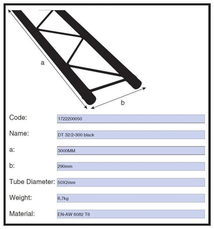 Das DT32 ist ein 2-Punkt-Traversensystem, das mit zwei konischen Verbindern, Bolzen und Splint verbunden wird. Der Vorteil beim Schnellverbinder-System liegt darin, dass es kraftschlüssig mit dem Gurtrohr (auch Tragrohr oder Hauptrohr genannt) abschließt und eine schnelle Montage beim häufigen Auf- und Abbau ermöglicht. Die zwei Gurtrohre sind aus 50 mm Aluminiumrohr mit 2 mm Wandstärke gefertigt und geben diesem System ein hervorragendes Gewichts-Belastbarkeitsverhältnis. Die Streben haben einen Durchmesser von 20 mm bei 2 mm Wandstärke.