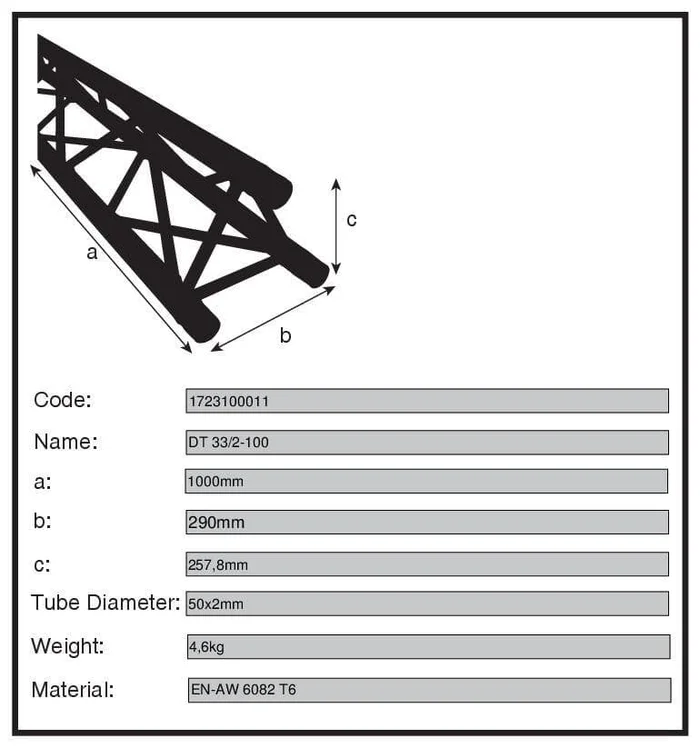Die DT33/2-Serie ist aufgrund ihrer hohen Tragfähigkeit und Leichtbauweise eines der meistverkauften Traversensysteme überhaupt. Dieses Schnellverschlusssystem schließt kraftschlüssig mit dem Gurtrohr und ermöglicht einen schnellen Aufbau bei häufigem Auf- und Abbau. Die Hauptrohre bestehen aus 50 mm Aluminiumrohr mit einer Wandstärke von 2 mm und verleihen diesem System ein hervorragendes Verhältnis von Festigkeit zu Gewicht. Die Streben haben einen Durchmesser von 20 mm bei einer Wandstärke von 2 mm. Jedes Traversenstück enthält alle erforderlichen konischen Verbinder, Stahlstifte und Sicherheitsclips.