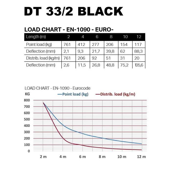 Die DT33/2-Serie ist aufgrund ihrer hohen Tragfähigkeit und Leichtbauweise eines der meistverkauften Traversensysteme überhaupt. Dieses Schnellverschlusssystem schließt kraftschlüssig mit dem Gurtrohr und ermöglicht einen schnellen Aufbau bei häufigem Auf- und Abbau. Die Hauptrohre bestehen aus 50 mm Aluminiumrohr mit einer Wandstärke von 2 mm und verleihen diesem System ein hervorragendes Verhältnis von Festigkeit zu Gewicht. Die Streben haben einen Durchmesser von 20 mm bei einer Wandstärke von 2 mm. Jedes Traversenstück enthält alle erforderlichen konischen Verbinder, Stahlstifte und Sicherheitsclips. Die mattschwarz beschichtete Version kann mit verschiedenen Standardlängen von 50cm, 75cm, 1m, 1,5m, 2m, 2,5m, 3m, 3,5m, 4m, 4,5m und 5,0 Meter erweitert werden (Sonderlängen auf Anfrage)