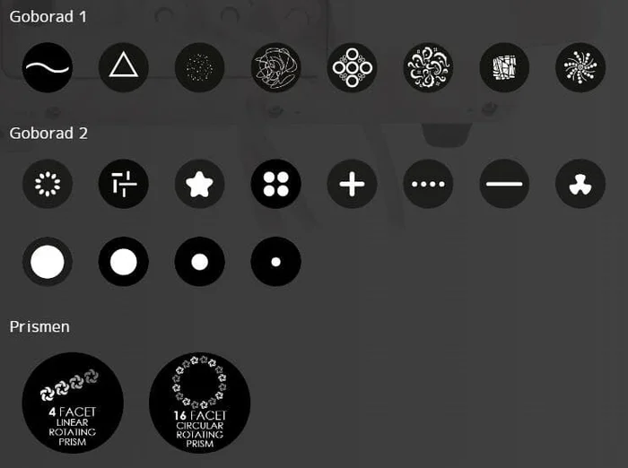 - rotierende und statische Gobos, Doppelprisma, Frostzoom