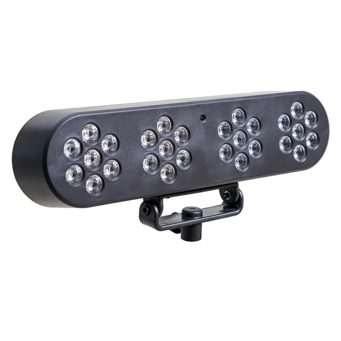 Die ETEC LED DJ Magic Bank 1 verfügt über 4 Scheinwerfer. Jeder dieser Scheinwerfer hat 7×1 Watt RGB LEDs. Im Lieferumfang ist ein Stativ und eine IR-Fernbedienung, mit der Sie alle Funktionen auch aus einiger Distanz bedienen können enthalten. Mit der Fernbedienung kann man z.B. die verschiedenen Betriebsmodi, Strobe Effekte oder feste Farben einstellen.