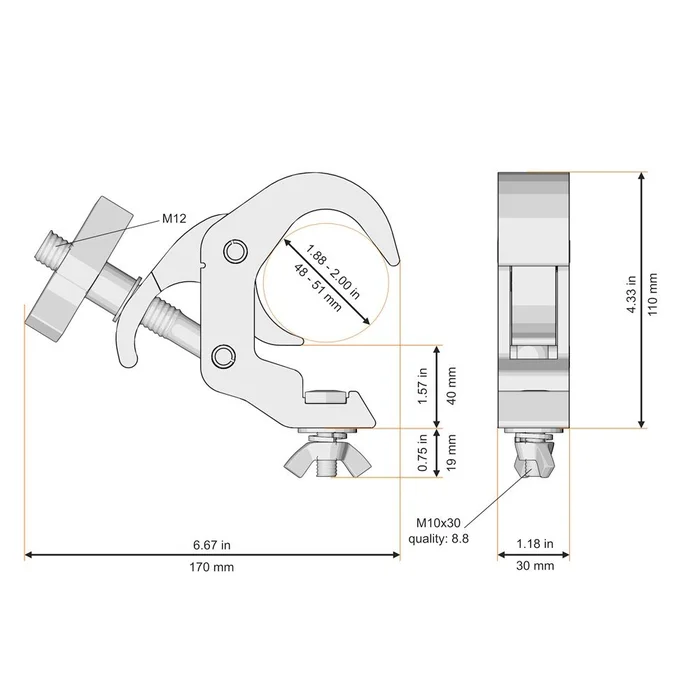 Beschreibung:Der ETEC Trigger-Haken C150 ist eine schnelle und einfache Möglichkeit, Geräte an einer Traverse zu befestigen. Durch seine besondere Bauform mit abgehender Schraube zur Seite kann sich diese niemals an den Geräten oder in der Traverse verhaken. Ein bequemes Verschließen durch die große Flügelmutter ist so zu jeder Zeit möglich.Technische Daten:Farbe: SilberKompatibilität: 38-51 mmMaterial: AluminiumBelastung maximal: 150kgAbgang: M10 Geräteschraube, Sprengring, Unterlegschraube