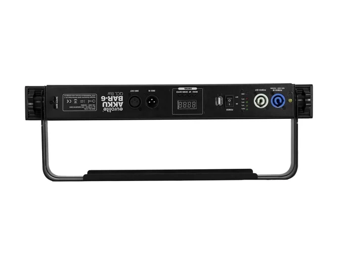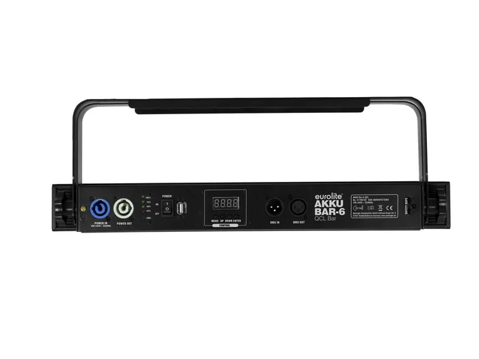 Technische Daten:Stromversorgung:100-240 V AC, 50/60 HzSchutzart:IP20Schutzklasse:SK IStromanschluss:Batterie/AkkuStromeinspeisung über P-Con (blau), Einbauversion Stromanschlusskabel mit Schutzkontaktstecker (mitgeliefert)Stromausgang:1 x P-Con (grau), EinbauversionAkkutyp:1 x Lithium-Ion 11,1 V, 10400 mAh, 115,44 WhLampenart:LED-LampeLED-Typ:6 x 8 W high-power 4in1 QCL RGBW (homogene Farbmischung)DMX-Kanäle:4; 6; 8; 11; 12; 13; 17; 24; 29DMX-Eingang:1 x 3-pol XLR (M) EinbauversionDMX-Ausgang:1 x 3-pol XLR (W) EinbauversionKühlung:Passive KonvektionskühlungAnsteuerung:Stand-alone; DMX; Master/Slave Funktion; Musiksteuerung über Mikrofon; IR-Fernbedienung; W-DMX by Wireless Solution über USB (optional); CRMX by LumenRadio über USB (optional); QuickDMX über USB (optional)Vorprogrammiert bei:LED PC-Control 512; EASY SHOW 1; LED EASY OPERATOR 4×4; LED EASY OPERATOR 4×6; LED EASY OPERATOR DELUXE; Light´J; Light Captain; EASY SHOW 2; EASY SHOW 3; ColorchiefProjektion:FlimmerfreiAbstrahlwinkel:8°Abstrahlwinkel (1/2 Peak):8°Abstrahlwinkel (1/10 Peak):17°Gehäusefarbe:SchwarzAufnahmesystem:DoppelbügelMaße:Länge: 50,2 cmTiefe: 6 cmHöhe: 20,1 cmGewicht:3,80 kgGeräuschklassifizierung:Klasse 0 (keinerlei Geräusche)FernbedienungBatterie:1 x Knopfzelle 3,0 V CR2032 Lithium-Mangan eingebautRechtliche SpezifikationenSpezialprodukt:Nicht zur Raumbeleuchtung in Haushalten vorgesehenVerwendungszweck:Beleuchtung für Show-EffekteVideo: