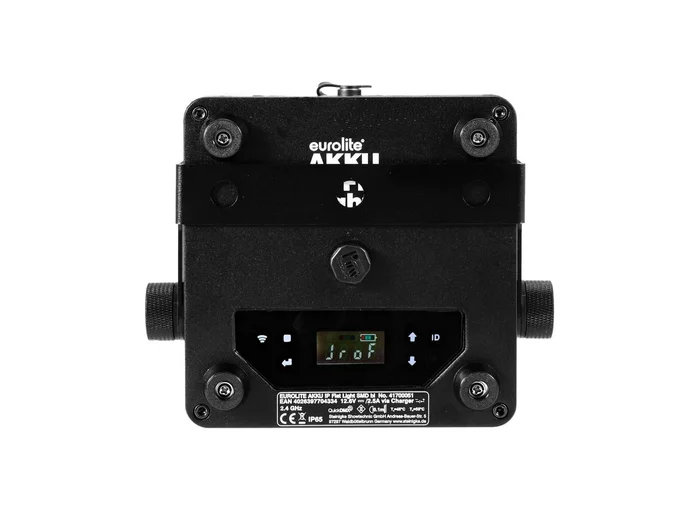 Technische Daten:Stromversorgung:100-240 V AC, 50/60 Hz12,6V DC 2500 mASchutzart:IP65Schutzklasse:SK IIIStromanschluss:Stromeinspeisung über Hohlstecker (M) Einbauversion Stromanschlusskabel mit Eurostecker (mitgeliefert)Batterie/AkkuAkkutyp:2 x Lithium-Ion 11,1 V, 2600 mAh, 28,86 WhAkku:Betriebsdauer bis zu 16h je nach verwendetem ProgrammLadedauer 4hLampenart:LED-LampeLED-Typ:81 x 0,2 W SMD 5050 4in1 QCL RGBW (homogene Farbmischung)Blitzrate:1 – 23 HzDMX-Kanäle:3; 4; 6; 8; 10Kühlung:Passive KonvektionskühlungAnsteuerung:Master/Slave Funktion; IR-Fernbedienung; QuickDMX; Stand-alone; Musiksteuerung über MikrofonVorprogrammiert bei:Light Captain; EASY SHOW 1; EASY SHOW 2; EASY SHOW 3; Light´J; ColorchiefProjektion:FlimmerfreiTrägerfrequenz:2,4 GHzAbstrahlwinkel (1/10 Peak):120°Gehäusefarbe:SchwarzDisplaytyp:LCD DisplayMaße:Länge: 17,2 cmBreite: 13,8 cmTiefe: 6,4 cmGewicht:1,60 kgGeräuschklassifizierung:Klasse 0 (keinerlei Geräusche)FernbedienungBatterie:1 x Knopfzelle 3,0 V CR2032 Lithium-Mangan eingebautRechtliche SpezifikationenSpezialprodukt:Nicht zur Raumbeleuchtung in Haushalten vorgesehenVerwendungszweck:Beleuchtung für Show-Effekte
