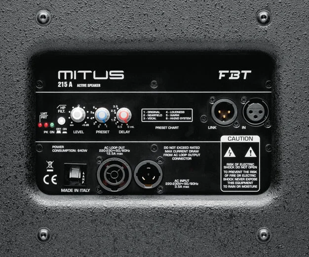 - Bedienfeld mit XLR-Eingang und Link, Lautstärke, Presets, HP-Filter, Ground-Lift