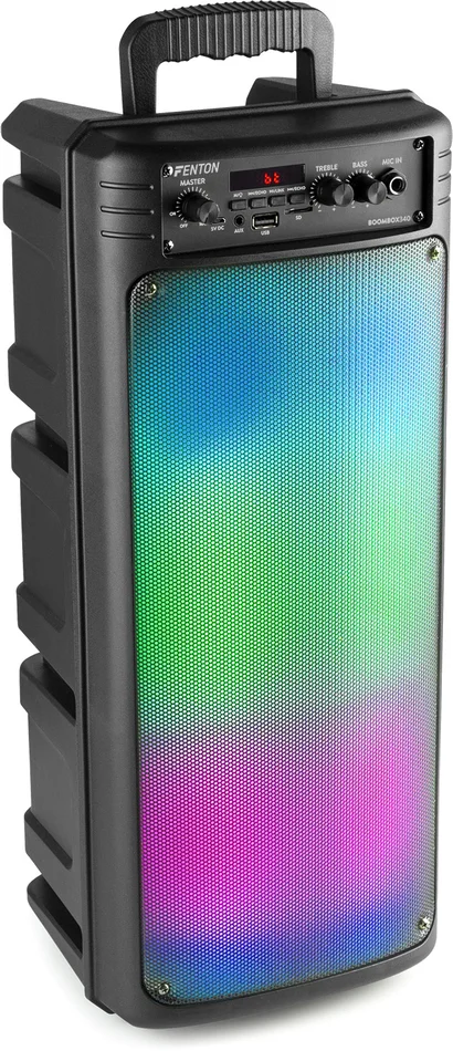 Mit dem BoomBox Wireless Party Speaker mit spektakulärer Lichtshow auf der Vorderseite bringen Sie Ihre Party auf die nächste Stufe. Dank des eingebauten Akkus, des Mikrofons und der zahlreichen Anschlussmöglichkeiten wie USB, Micro-SD-Karte und einer eingebauten Mikrofonbuchse können Sie ganz einfach zu all Ihren Lieblingssongs mitsingen. Der BoomBox-Party-Lautsprecher ist tragbar und kann horizontal oder vertikal aufgestellt werden, was für zusätzliche Flexibilität sorgt. Es ist auch möglich, zwei BoomBox Party Speaker kabellos miteinander zu verbinden, um einen noch kraftvolleren Stereosound zu erzeugen. Ideal für Home Entertainment, Karaoke, Schulen, Seminare und viele andere Anwendungen.