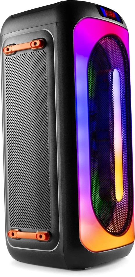 Dreh den Spaß auf! Bringen Sie Ihre Party auf ein neues Level mit dem BoomBox Wireless Party Speaker, der eine spektakuläre, beat-synchrone Lichtshow über die gesamte Front bietet. Dank des eingebauten Akkus, des Mikrofons und der zahlreichen Anschlussmöglichkeiten wie USB, Micro-SD-Karte und einer eingebauten Mikrofonbuchse können Sie ganz einfach zu all Ihren Lieblingssongs mitsingen. Der BoomBox Party Speaker ist tragbar und kann sowohl horizontal als auch vertikal aufgestellt werden, was für zusätzliche Flexibilität sorgt. Es ist auch möglich, zwei BoomBox Party Speaker kabellos miteinander zu verbinden, um einen noch kraftvolleren Stereosound zu erzeugen. Ideal für Home Entertainment, Karaoke, Schulen, Seminare und viele andere Anwendungen.