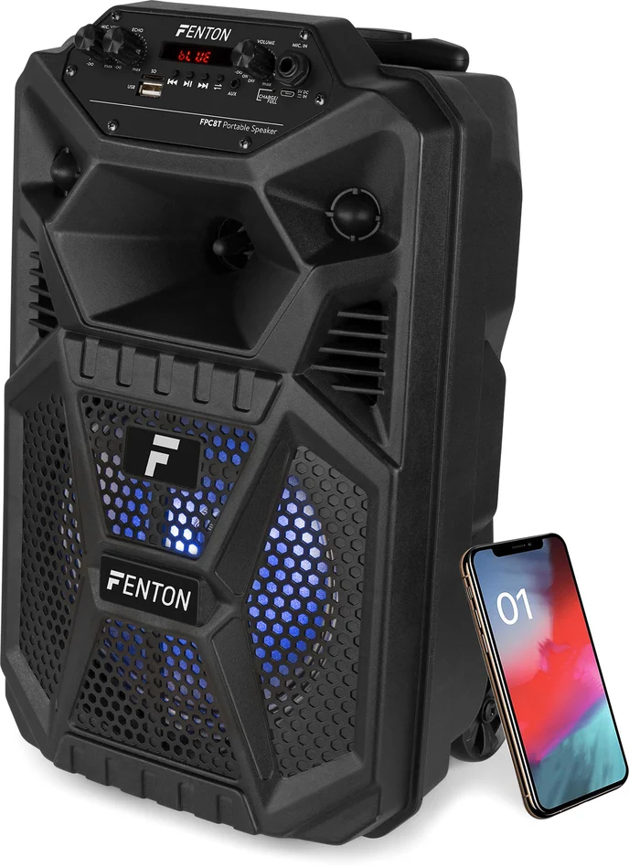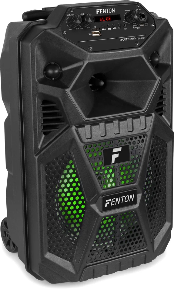 Der tragbare Party-Lautsprecher FPC8T bietet Sound-Performance in einem kompakten, leichten Gehäuse mit Teleskopgriff und Rädern, die das Musikhören unterwegs erleichtern. Koppeln Sie ihn einfach mit Ihrem Smartphone, verwenden Sie einen MicroSD-Karten-/USB-Treiber oder schließen Sie ein 3,5-mm-Audiokabel an Ihr Gerät an, wenn keine drahtlose Verbindung verfügbar ist. Das eingebaute bunte Discolicht im Grill sorgt für einen tollen Effekt auf jeder Party. Betreiben Sie diesen Party-Lautsprecher über das Stromnetz oder nehmen Sie ihn mit dem eingebauten Akku überallhin mit. Schließen Sie das mitgelieferte Mikrofon an und singen Sie mit!