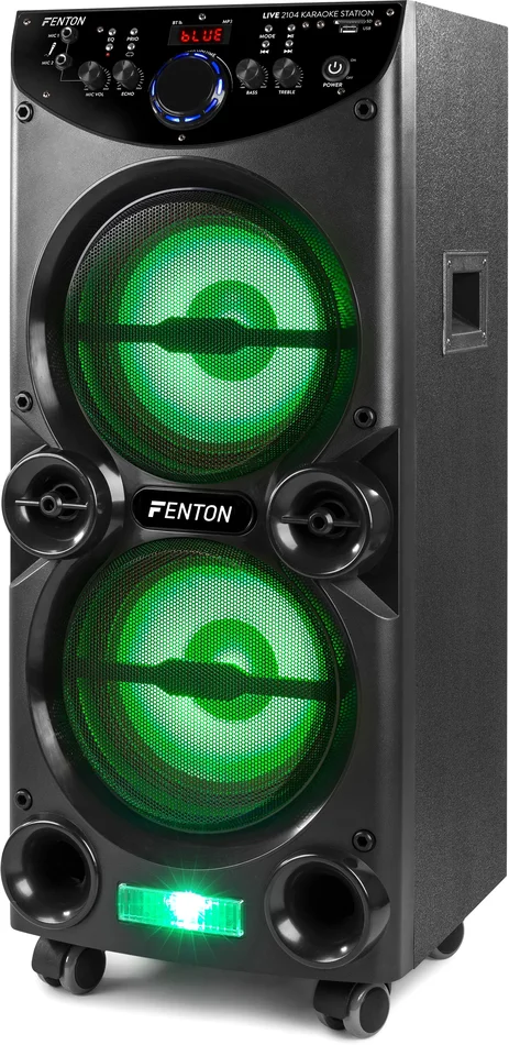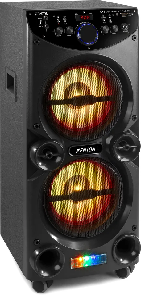 Wenn Sie robuste Haltbarkeit und endlose Konnektivität wünschen, dann wird diese LIVE2104 Karaoke Station von Fenton die Party zum Laufen bringen. Mit zahlreichen Eingangsoptionen, USB- und Micro-SD-Kartenanschlüssen, einem Multimedia-Player mit Aufnahmefunktion und verschiedenen LED-Lichtern ist dies ein Lautsprecher, der toll aussieht und noch besser klingt! Die LIVE2104 Karaoke Station, die sich durch die fortschrittliche Wireless BT Technologie auszeichnet, bringt Ihnen hochwertige Musik und garantiert ein kristallklares Signal, auch wenn Sie weit vom Gerät entfernt sind. Das Koppeln Ihres Telefons, Tablets oder eines anderen BT-fähigen Geräts ist super einfach! Wenn Sie also auf der Suche nach hoher Leistung, großem Sound und einer spektakulären Lightshow sind, ist LIVE2104 der Party-Starter! Inklusive 2 kabelgebundenen Mikrofonen.