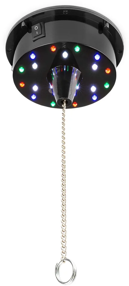 Hochreflektierende Discokugel mit batteriebetriebenem, geräuscharmem Motor für Spiegelkugeln bis zu 2 kg, ausgestattet mit 18 farbigen LEDs. Besonders in der Dunkelheit ergibt sich so ein verblüffender Effekt. Standalone oder mit Sound aktiviert.