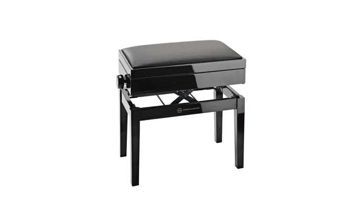 Komplette Klavierbank mit Sitzpolster und integriertem Notenfach. Solides europäisches Buchenholz, vierfach schwarz hochglanz lackiert. Stabile Beine mit rutschfesten Parkettschonern. Leichtgängige, präzise Spindelmechanik mit Doppelscherensystem zur Verstellung der Sitzhöhe. Strapazierfähige Sitzpolster aus MDF Material mit schwarzem Kunstlederbezug. Die Bank wird platzsparend geliefert und ist mit wenigen Handgriffen aufgebaut.