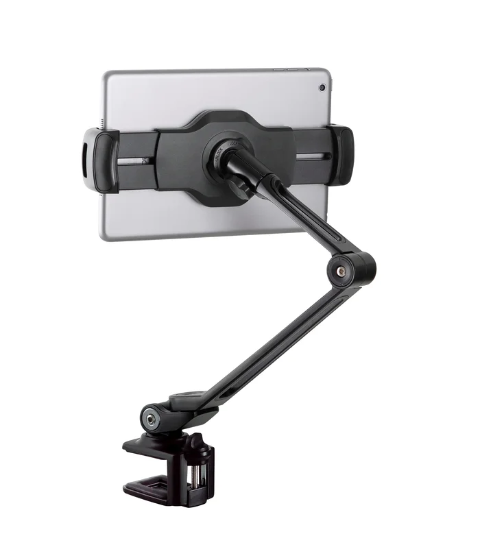 Stylischer und praktischer Halter für Smartphones und Tablets mit Tischklemme. Der Halter kann Geräte mit einer Größe von 10,2 bis 13“ aufnehmen. Das entspricht einer Klemmbreite von 130 bis 224 mm. Die Klammern und die Anlagefläche sind mit rutschfestem Gummi überzogen und sorgen somit für zusätzliche Sicherheit und einen schonenden Grip. Die Halterung lässt sich über einen Kugelkopf individuell und stufenlos einstellen. Der Auslegerarm kann um 360° gedreht werden und lässt sich in Neigung, Höhe und Schwenkbereich individuell einstellen. Der Klemmbereich der Tischklemme reicht von 10 bis 35 mm. Die Klemmflächen sind mit Gummi überzogen und schützen somit die Tischplatte vor Beschädigungen.