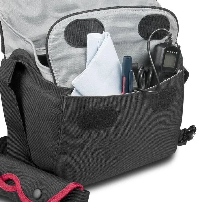 Die herausnehmbare Inneneinteilung der mantona Cool Bag ist komfortabel gepolstert, so dass DSLR Kameras und das entsprechende Zubehör jederzeit vor Stößen geschützt sind. Die einzelnen Innenfächer sind variabel durch Klettverschlüsse verbunden, was eine individuelle Einteilung ganz nach Ihren Wünschen ermöglicht. So stellt auch der Transport einer Kamera mit angesetztem Objektiv mit dieser sportlich-eleganten Kameratasche kein Problem dar. Ohne Trennkissen wird die Tasche zu einer modischen Messenger-Bag.