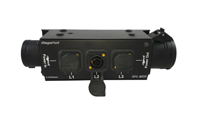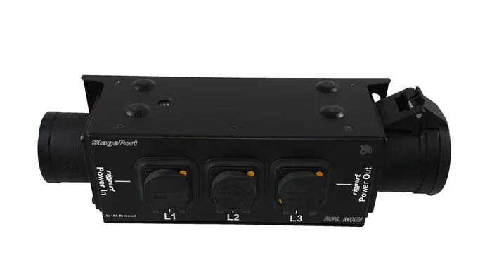 CEE16, 3-Phasen-Stromverteiler mit seitlichen Abgängen. Powercon-T1 Abgriffe aller drei Phasen.