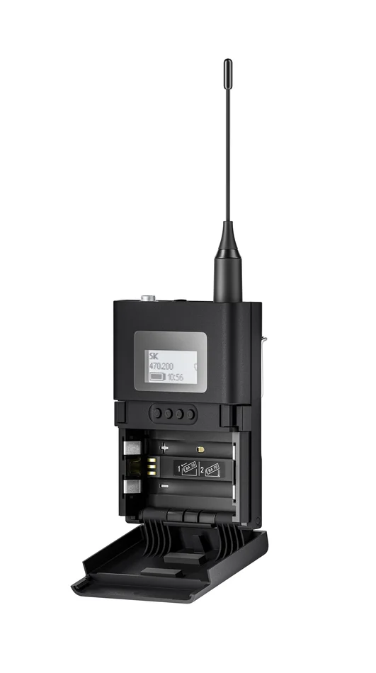 - Spannungsversorgung: 2 AA-Batterien 1,5 V (Alkali-Mangan) oder Sennheiser BA 70 Akku