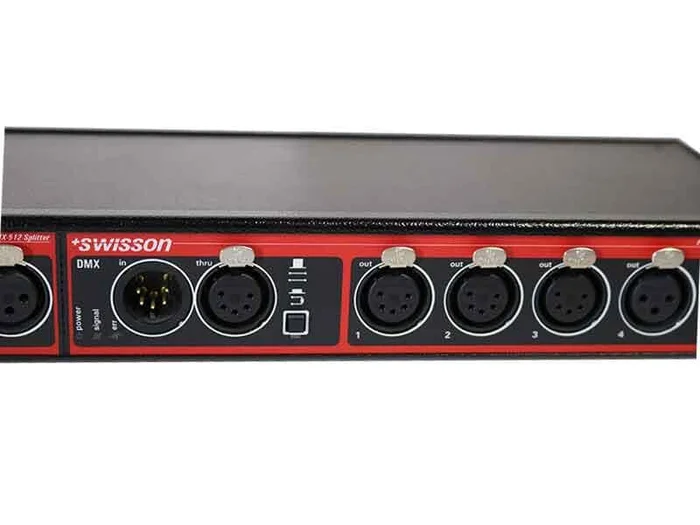 - Signalverteilung: 2x DMX in (5-pol.) auf 10 x DMX out (2x 3×5 2×3-pol.) thru (5-pol.)