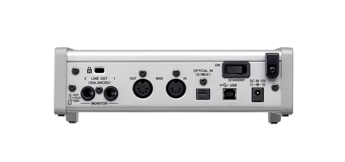 Die beiden analogen Kombi-Eingänge für Mikrofone, Line-Quellen und Instrumente verfügen über transparente, natürlich klingende und rauscharme Ultra-HDDA-Mikrofonvorverstärker von Tascam und individuell schaltbare Phantomspeisung (48 Volt). Bei Verwendung des optischen Digitaleingangs, der bis zu acht Audio-Eingangskanäle von einem ADAT- oder S/MUX-kompatiblen Gerät entgegennehmen kann, stehen maximal zehn Eingänge (vier bei 192 kHz) zur Verfügung. Zum Abhören gibt es zwei Kopfhörerausgänge mit eigenem Pegelregler und zwei Line-Ausgänge über symmetrische 6,3-mm-Klinkenbuchsen. Außerdem können Sie Ihre MIDI-Geräte an den rückseitigen MIDI-Eingang und -Ausgang anschließen, um sie mit Ihrer Aufnahmesoftware zu verwenden.