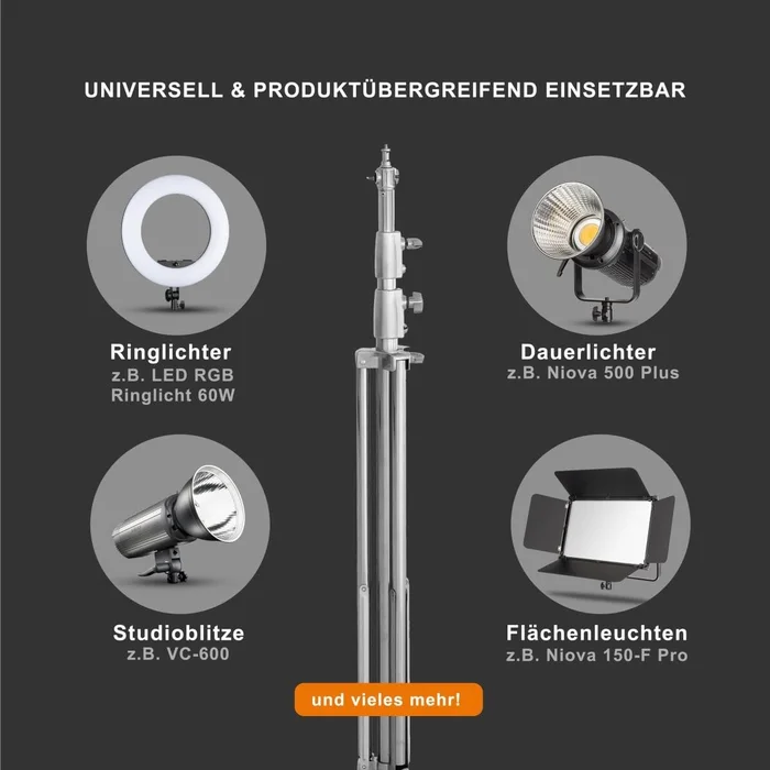 - Lampenstativ aus Edelstahl mit sehr hoher Traglast bis zu 15 kg, dabei sehr leicht