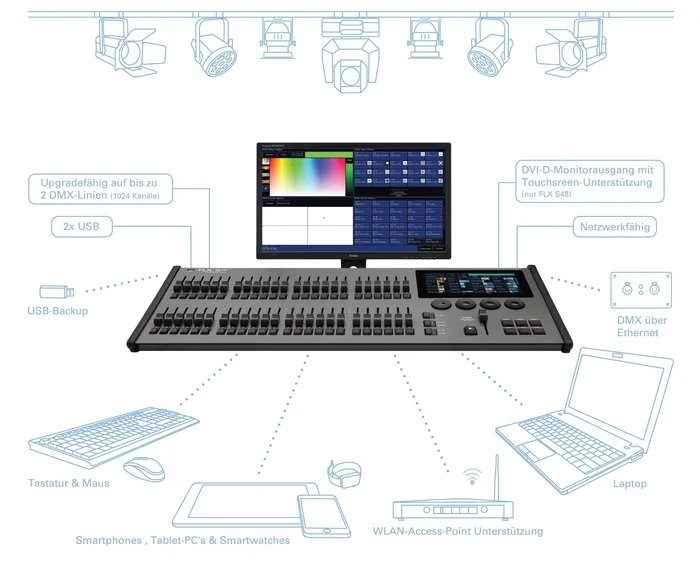 - Netzwerk-Anschlüsse: Ethernet-Schnittstelle zur Unterstützung von Smartphones und Tablet-PC’s via W-LAN und für DMX-Visualisierungen